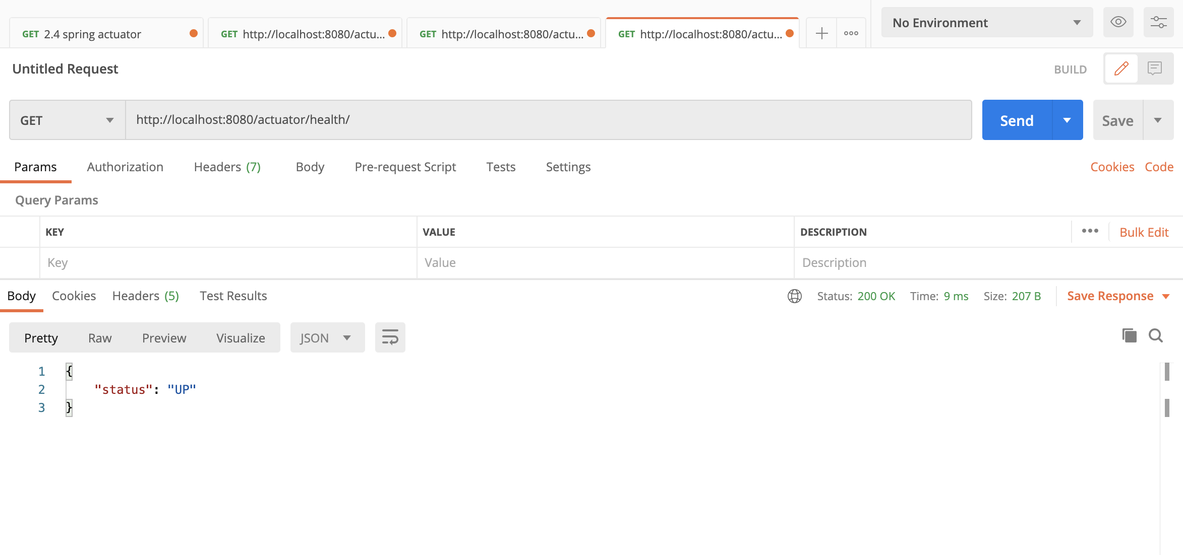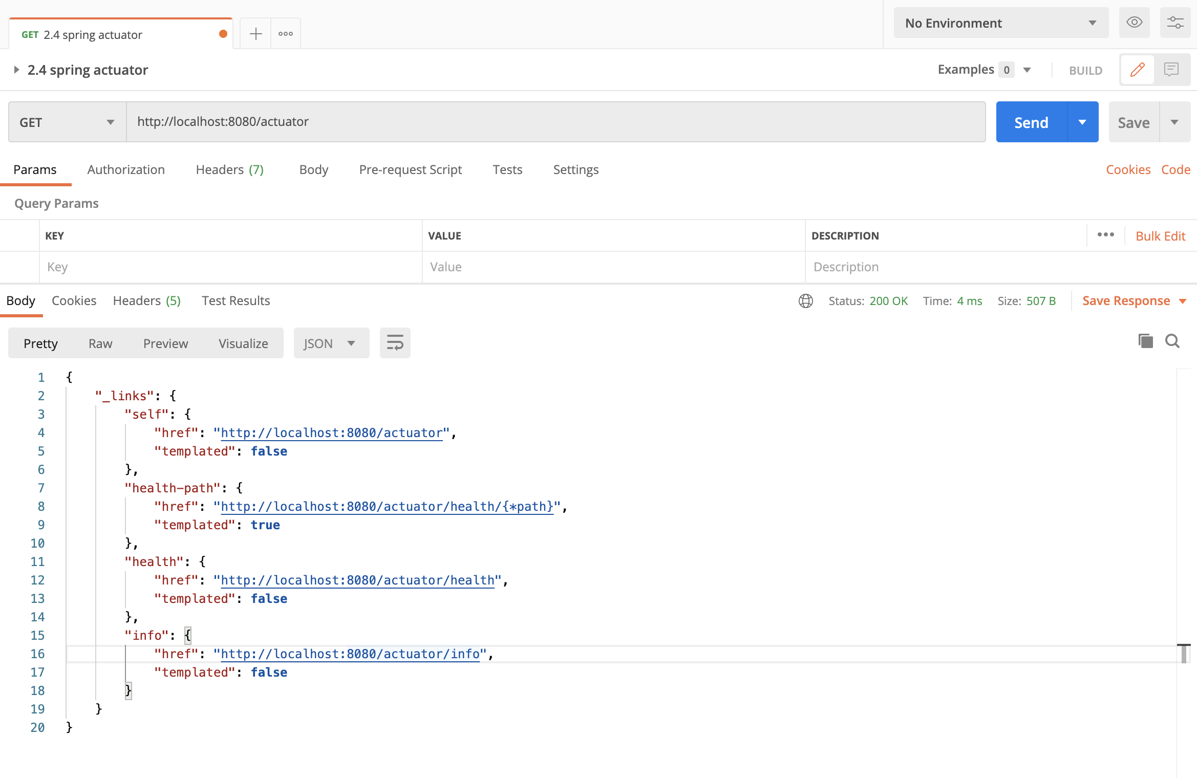 spring-boot-actuator 모듈을 추가한 후에 빌드하고 어플리케이션을 실행하고 actuator의 endpoint를 브라우저나 postman에서 호출하면 아래와 같은 결과가 나타납니다.