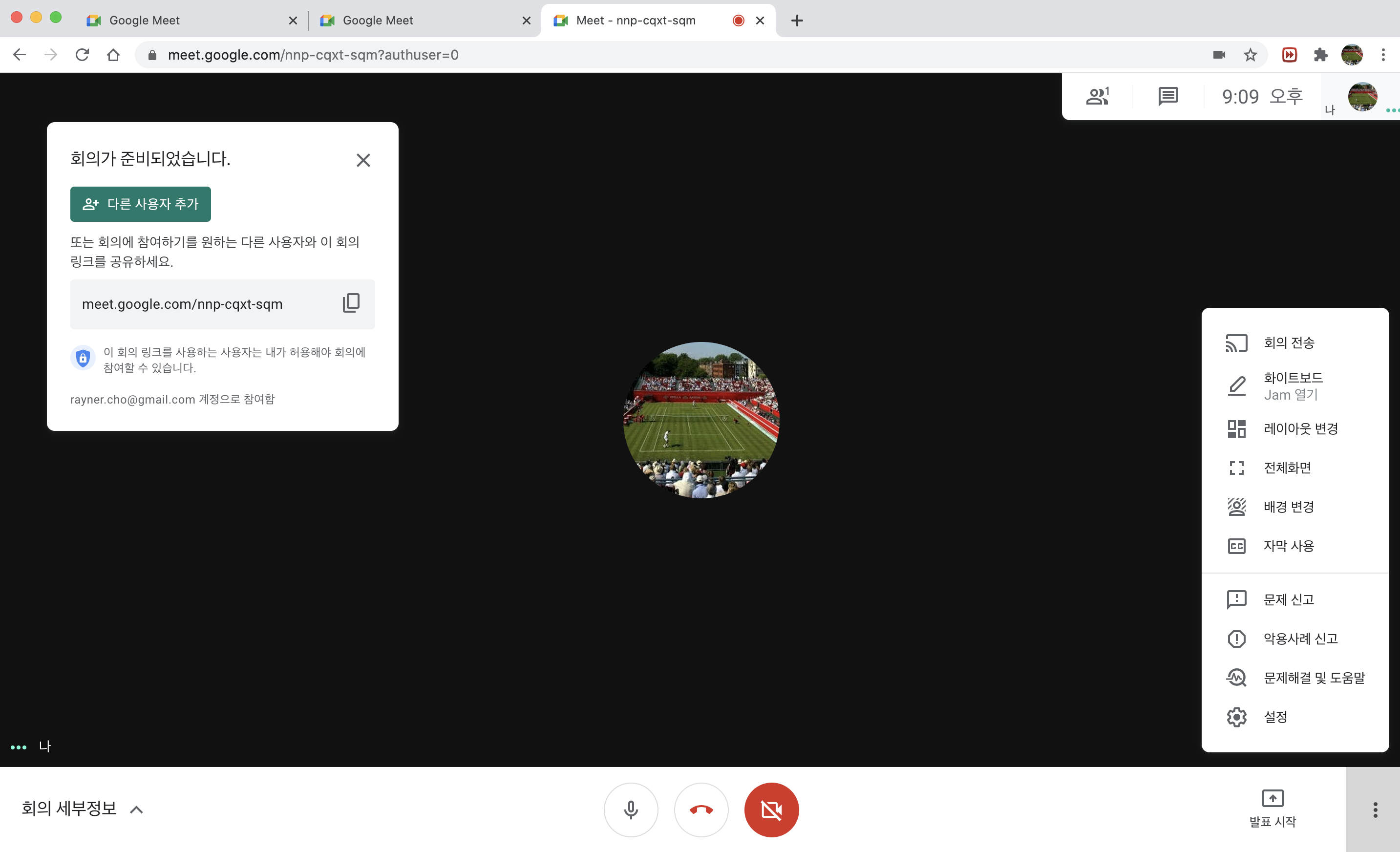 왼쪽 하단의 "새 회의" 버튼을 클릭한 후 "즉석 회의 시작"을 선택하면 회의를 위한 방에 생성됩니다. 생성된 방으로 참여자를 초대하시려면 "다른 사용자 추가"를 눌러서 직접 연락처를 선택하거나 메일 주소를 입력하거나 회의 링크(meet.google.com/mnp-cqxt-sqm)를 복사해서 공유하는 방법이 있습니다.
