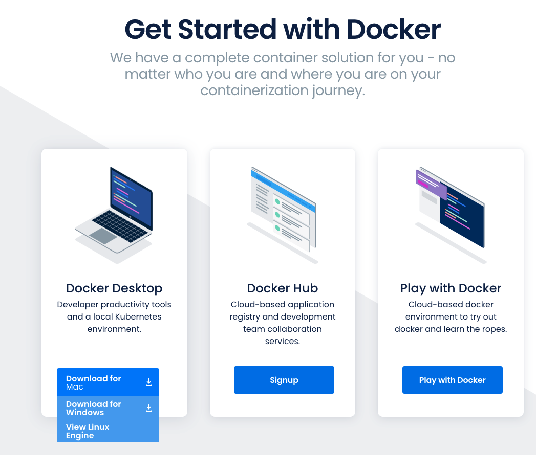 Docker 사이트에 방문에서 화면 메인에서 "Get Started"를 누르면 설치 프로그램 다운로드 페이지로 이동합니다. 각자 자신의 운영체제에 맞는 설치 프로그램을 선택해서 다운로드 후 설치를 진행하시면 됩니다.