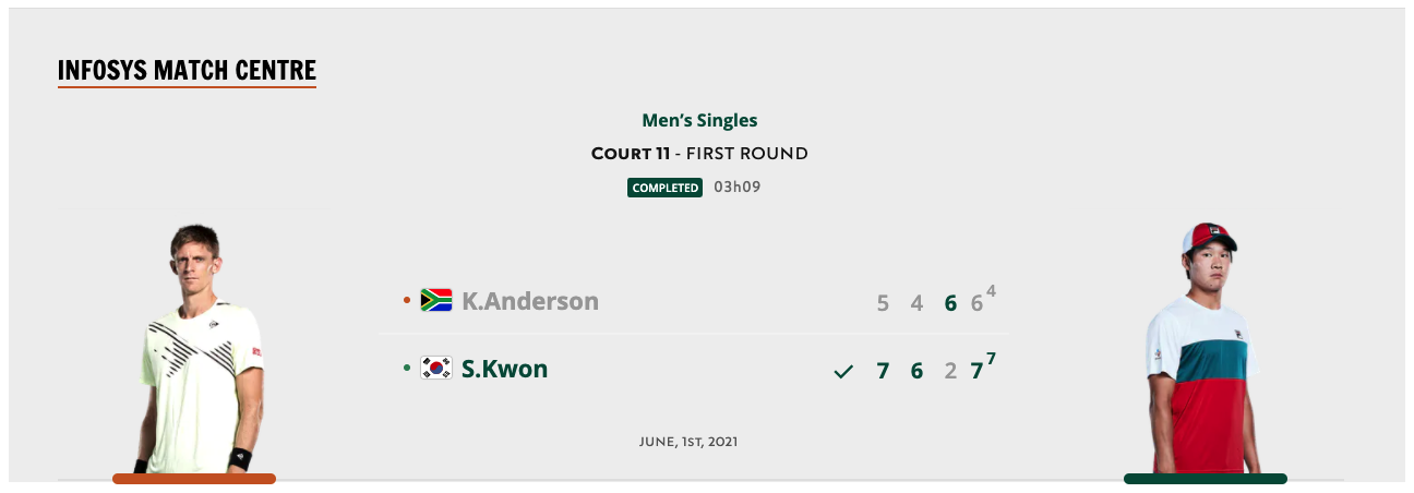 올해 프랑스오픈 본선에 출전한 유일한 한국 선수인 권순우(91위)가 남아프리카공화국의 케빈 앤더슨(100위)을 3-1로 꺽고 1회전을 승리하였습니다.